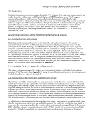 Starbucks faces both opportunities and threats in its mature industry. It has strong global brand recognition and quality products but faces high competition. While international expansion presents opportunities, oversaturation in the US and dependence on the American market are weaknesses. Starbucks aims to leverage its scale and technology while adapting to changing consumer tastes globally.