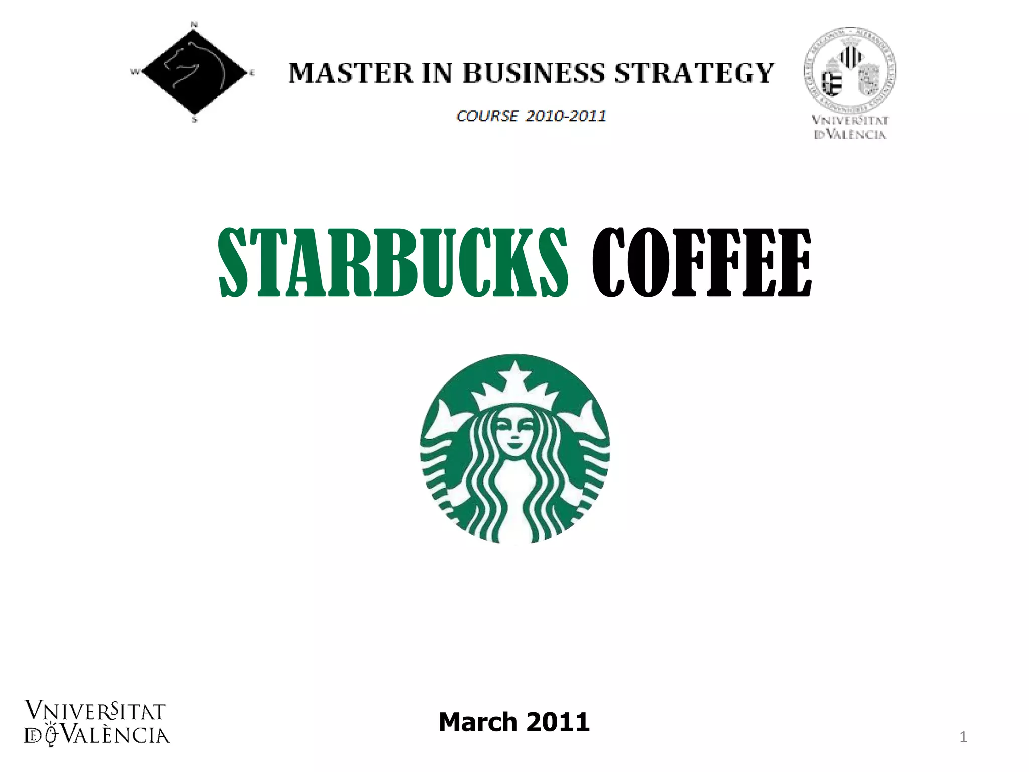 The document is a March 2011 report on Starbucks, including its company profile, industry analysis, and competitive landscape. It discusses the resources and capabilities that give Starbucks a competitive advantage, particularly through VRIO analysis. Additionally, it addresses future strategic considerations for the company.
