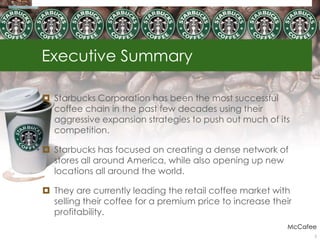 Starbucks has been highly successful in expanding its coffee chain across the US and world through aggressive growth strategies. However, it now faces increased competition from other chains like Dunkin' Donuts, McDonald's, and Caribou Coffee who are targeting the coffee market. These competitors have launched advertising campaigns and promotional tactics directly taking aim at Starbucks to gain market share in the retail coffee space. Starbucks remains the leading chain but must continue adapting to changing consumer preferences and competitive threats to maintain its success.