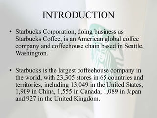 Starbucks is the largest coffeehouse company in the world with over 23,000 stores globally. It serves hot and cold coffee and tea beverages as well as snacks. Starbucks has pursued an aggressive global expansion strategy and ensures ethical sourcing and community involvement. It faces competition from substitute products but maintains power over suppliers. Recommendations include expanding into tea and juice, targeting rural markets, and improving their mobile app integration.