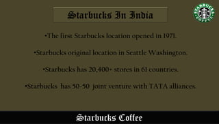 Starbucks first opened in 1971 in Seattle, Washington. It now has over 20,400 stores across 61 countries. Starbucks utilizes a variety of marketing strategies including social media campaigns, mobile apps, and strategic store locations to target customers ages 18-40, particularly in urban areas. The company faces competition from local cafes and risks associated with market trends and joint ventures.