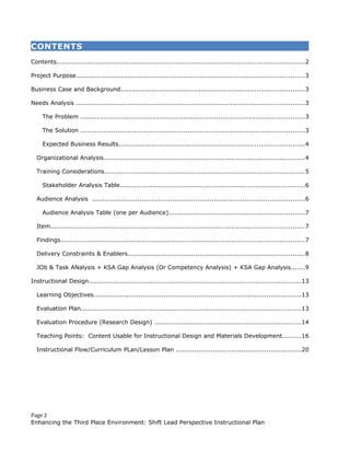 This document outlines a proposed training plan for Starbucks Shift Leads. The training aims to help Shift Leads enhance the "third place environment" by improving their communication skills, raising partner morale during stressful times, resolving tensions, and problem solving complex situations.