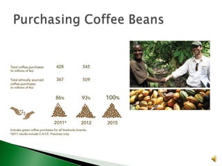 This document summarizes the history and operations of Starbucks from its founding in 1971 through 2012. It discusses Starbucks' origins, expansion nationally and globally, changes in strategic vision over time including the return of Howard Schultz as CEO in 2008, financial performance, employee training, culture and community involvement, ethical sourcing practices, quality control systems, use of lean operations, and issues facing management in 2012 such as commodity costs and strong competition.