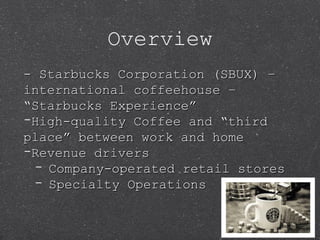 - Starbucks is an international coffeehouse chain known for its "third place" environment and focus on quality coffee and customer experience. It has over 19,000 stores globally and generates most of its revenue from company-operated retail stores and specialty operations.
