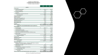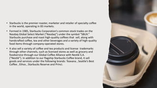 Starbucks' financial ratios reveal some areas of strength as well as opportunities for improvement. Positives include healthy profit margins, efficient inventory and receivables management, and high returns on assets and investments. However, ratios also point to potential liquidity issues, weak returns on equity, and negative cash flows and book value per share that suggest underperformance. Addressing high debt levels and improving cash generation could help optimize Starbucks' financial profile.