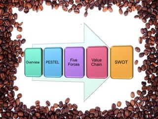 The document outlines a comprehensive analysis of Starbucks, focusing on various political, economic, social, technological, and environmental issues affecting the business. It includes insights into advertising challenges, competitive forces, value chain analysis, and a SWOT analysis highlighting strengths, weaknesses, opportunities, and threats. Starbucks' commitment to sustainability and responsible sourcing is emphasized, along with specific examples of their initiatives and legal considerations.