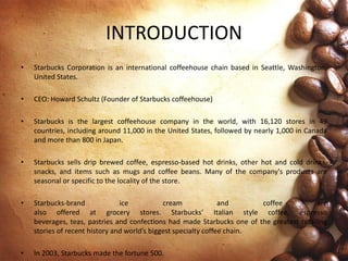 Starbucks' strategy focuses on its dominant position in the specialty coffee market through its extensive global store network. However, it faces high competition from thousands of smaller coffee shops and substitutes like tea. Starbucks relies on its core coffee and espresso drinks as cash cows but looks to expand internationally and through new products like instant coffee. Its supply chain carefully sources, samples, roasts, and packages coffee beans to ensure quality in its stores worldwide.