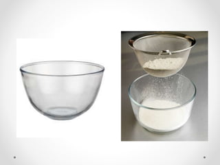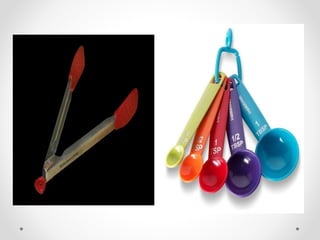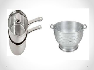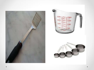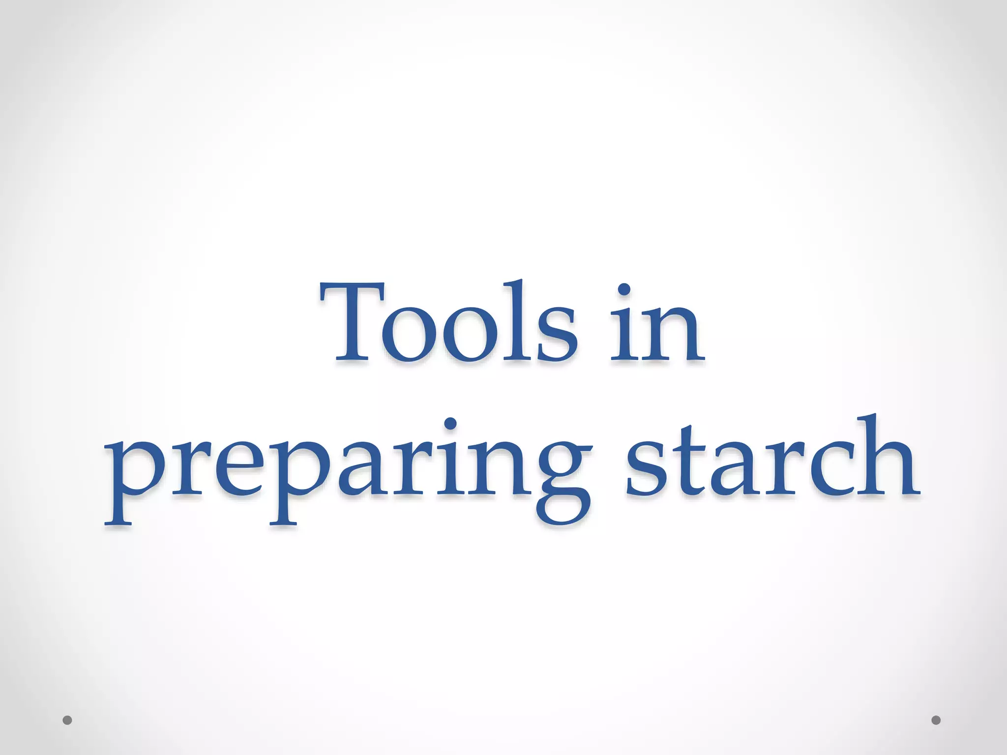 This document lists various kitchen tools used in preparing starches such as sauce pans, pots, kettles, rice cookers, double boilers, pressure cookers, colanders, canisters, knives, mixing bowls, sifters, spoons, scrapers, and measuring cups and spoons. It also notes that native starch is a powder obtained from plants containing starch, and is used as a thickening agent and stabilizer.