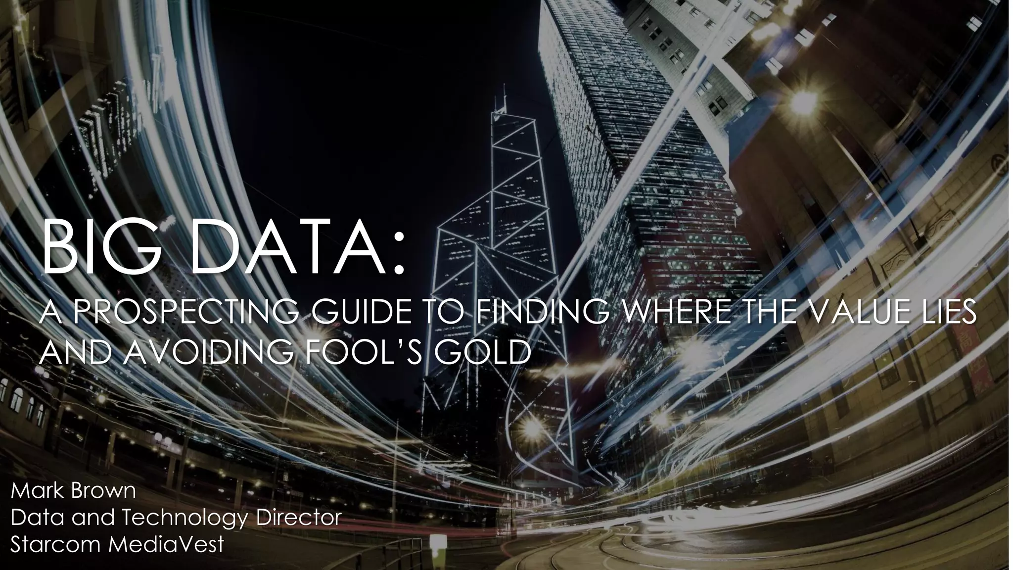 The document provides 5 golden rules for finding value in big data and avoiding "fool's gold": 1) Don't try to analyze all data, focus on specific areas. 2) Create a solid foundation of clean, organized data. 3) Stay focused on critical areas rather than getting distracted. 4) Apply basic analytical techniques rather than complex methods. 5) Put data at the center of the process, testing ideas and measuring results through iteration.