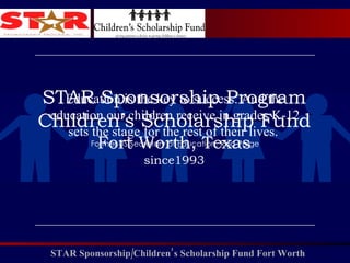 The STAR Sponsorship Program, established in 1993 in Fort Worth, Texas, provides scholarships to low-income families to enhance children's education, having awarded nearly 3,100 scholarships worth over $3.5 million. The program emphasizes parental involvement and student accountability, aiming to improve academic achievement through school choice. Donors play a critical role in funding the initiative, which strives to build a stronger, more educated workforce for the community.