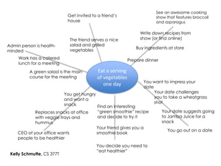 The Starfish Technique is used to brainstorm sequences of behaviors that could lead to a target behavior. It involves drawing "legs" radiating from a central starfish shape to map out different pathways. An example starfish maps out ways someone might end up eating more vegetables, through steps like seeing a cooking show, getting invited to a friend's house where vegetables are served, writing down recipes, buying ingredients, and preparing the meal. The key is to identify intermediary behaviors that could cascade into the desired outcome.