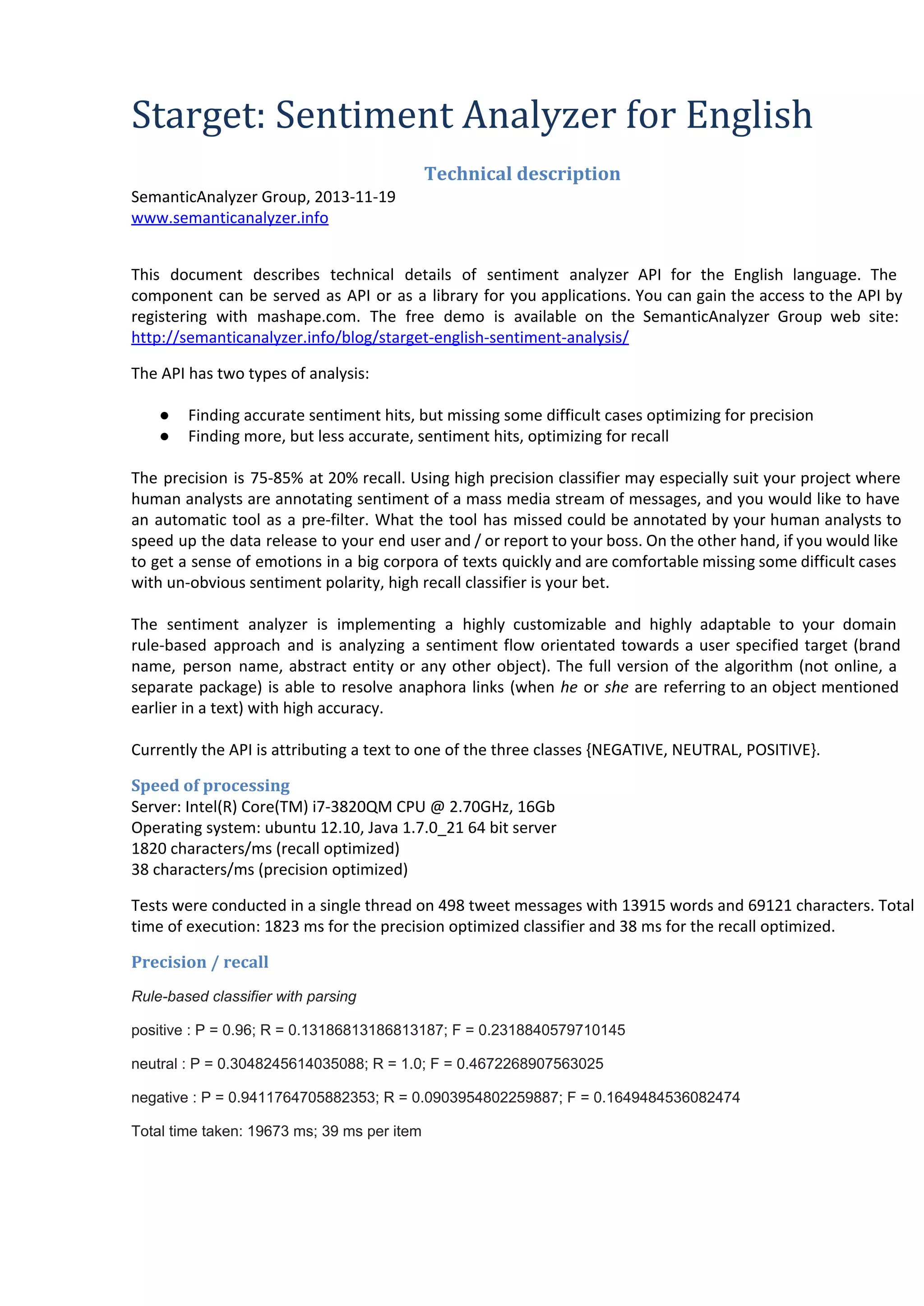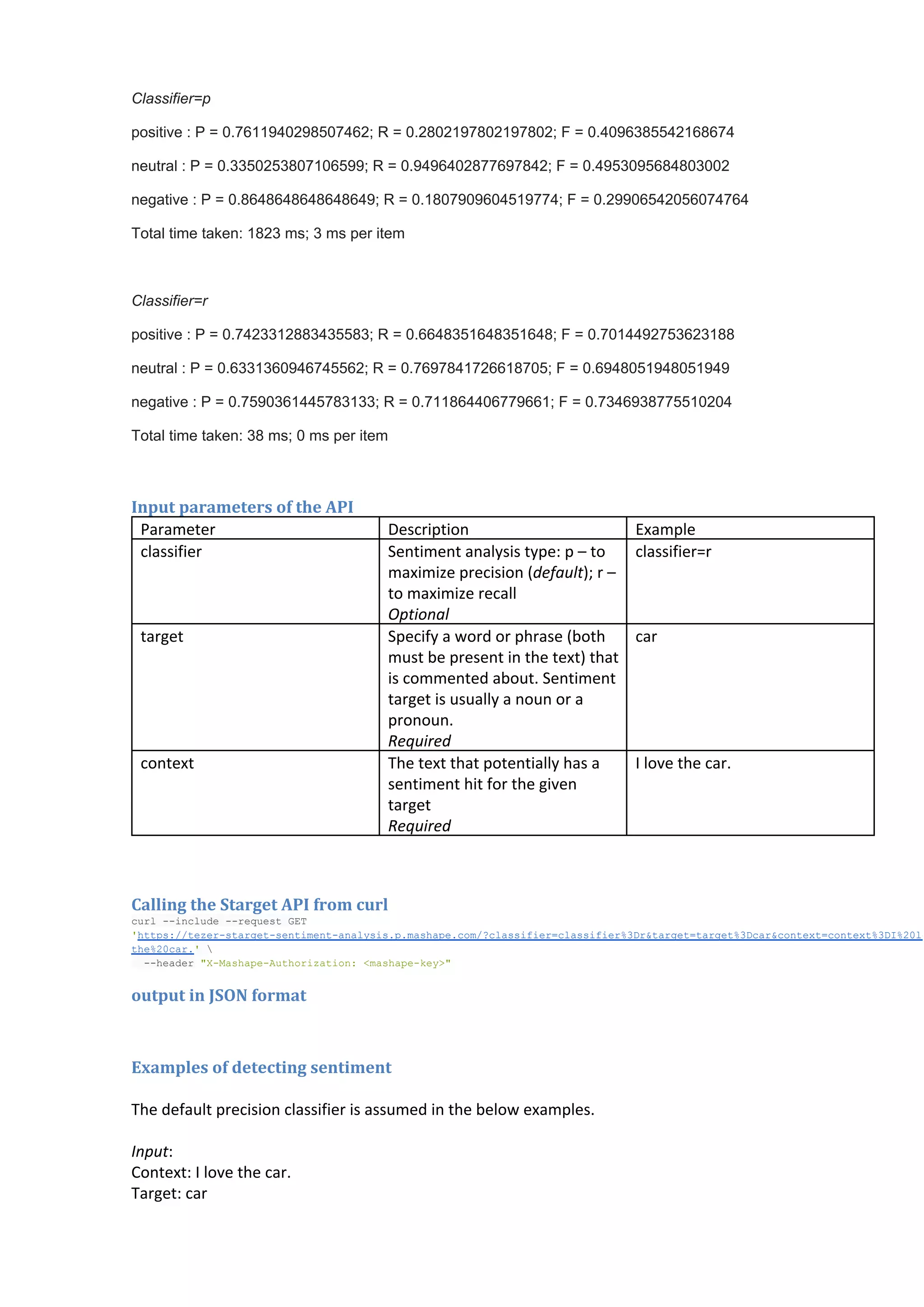 The document describes the technical details of an API for sentiment analysis of English text, which can be accessed for free on the SemanticAnalyzer Group website and via the Mashape API platform. The sentiment analyzer uses either a high precision or high recall classifier and can identify sentiment in text as positive, negative, or neutral. It also provides customizable sentiment analysis that can orient sentiment towards a specified target entity mentioned in the text.