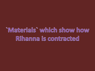 Rihanna's values and beliefs are reflected through her music and image. She presents herself as daring and not afraid to challenge social norms regarding sexuality and gender. Her image has transformed over her career from innocent to highly sexualized. She believes in living freely and rebelling against expectations. Some criticize her sexualized content as promoting the objectification of women. Rihanna sees herself as an artist who lives authentically without worrying about controversy or response.