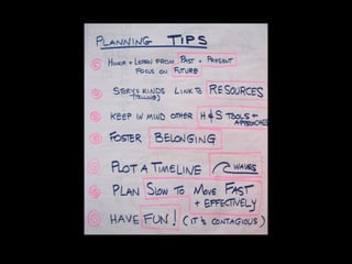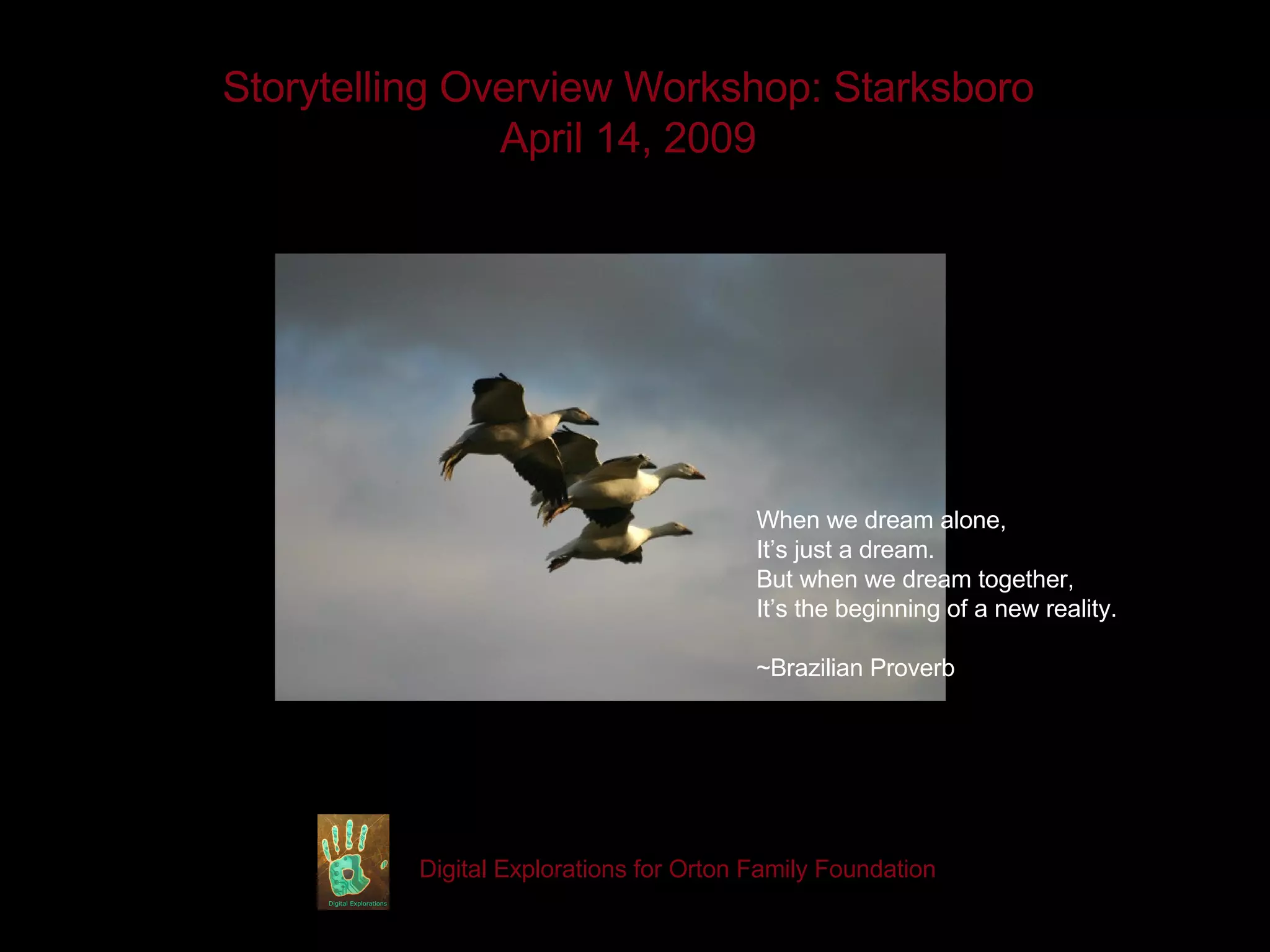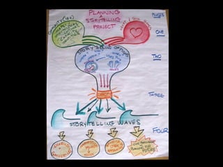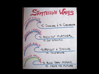 This document provides an overview of a storytelling workshop that aims to use stories and storytelling to build community and envision a sustainable future. The workshop covers why storytelling is important, different types of stories and mediums, techniques for facilitating story circles, and planning next steps like matching stories to goals and mapping community groups and capacities. The goal is to use stories to celebrate the past and present while encouraging active citizenship, reconciliation, and new thinking about the community's future.