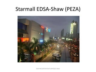 This document describes available commercial space for lease in the Starmall EDSA-Shaw shopping center in Mandaluyong City. There are two units available on the second floor totaling 806 square meters. The lease rate is 700 pesos per square meter plus VAT with additional monthly dues and air conditioning charges. The spaces are considered "bare shell" meaning they have no ceiling, rough flooring, or paint and full renovations are required by the tenant. Inquiries about the space can be directed to the listed contacts.