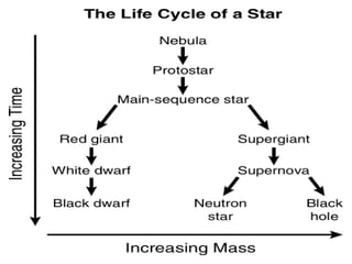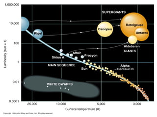 Stars are classified using the Hertzsprung-Russell diagram, which plots stars' luminosity against their surface temperature. Most stars lie on the main sequence, including our Sun. Stars produce energy through nuclear fusion, with hydrogen fusing to form helium in their cores. This process powers stars for billions of years until they run out of hydrogen fuel and evolve into other stages like red giants or white dwarfs. The Sun has various internal layers and an atmosphere, and features like sunspots and solar flares occasionally appear on its surface.