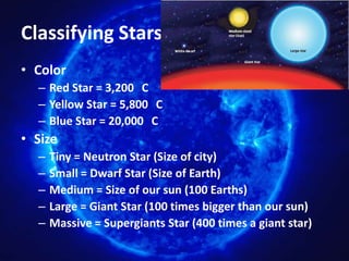 This document discusses how stars are classified based on their color, size, chemical composition, brightness, and location in the Hertzsprung-Russell diagram. It also describes the life cycles of stars from their birth as nebulae or protostars through their main sequence lifetimes fueled by nuclear fusion, to their deaths as red giants, planetary nebulae, white dwarfs, neutron stars, pulsars, or black holes depending on their original size.