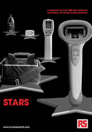 This document provides a selection of over 400 star products and offers that are ready for fast delivery from www.rs-components.com. It includes a wide range of products across applications to meet various needs. Customers can also find 500,000 additional products online and always with the trusted reliability of RS Service.