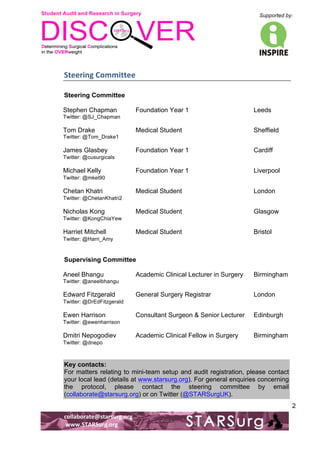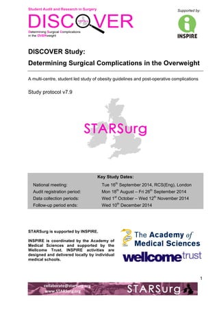 The document outlines a multi-centre, student-led study aimed at assessing surgical complications related to obesity, following NHS guidelines for identifying overweight patients. It details project timelines, methods for data collection, and compliance aims to evaluate post-operative outcomes over a specified period from October to December 2014. The study is part of the Starsurg initiative, which encourages student participation in surgical research and data collection across UK and Irish medical schools.
