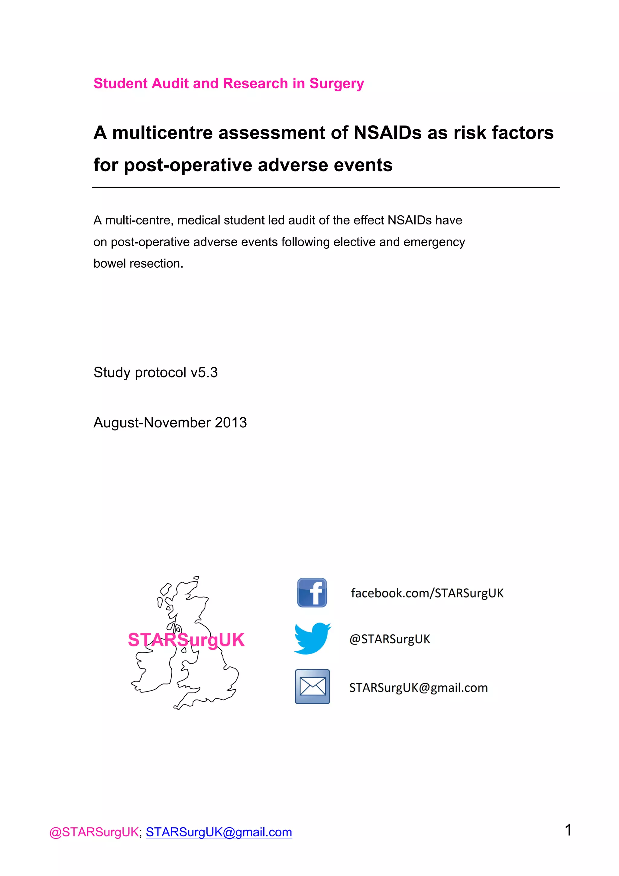 This document outlines a multicenter audit protocol led by medical students to evaluate the safety-risk profile of non-steroidal anti-inflammatory drugs (NSAIDs) in the post-operative period following bowel resections. The study aims to address concerns about the potential increase in adverse events associated with NSAID use, while gathering observational data to improve patient care in surgical practices across the UK. It specifies inclusion and exclusion criteria, methods for data collection, and analysis, ensuring robust oversight and collaboration among participating institutions.