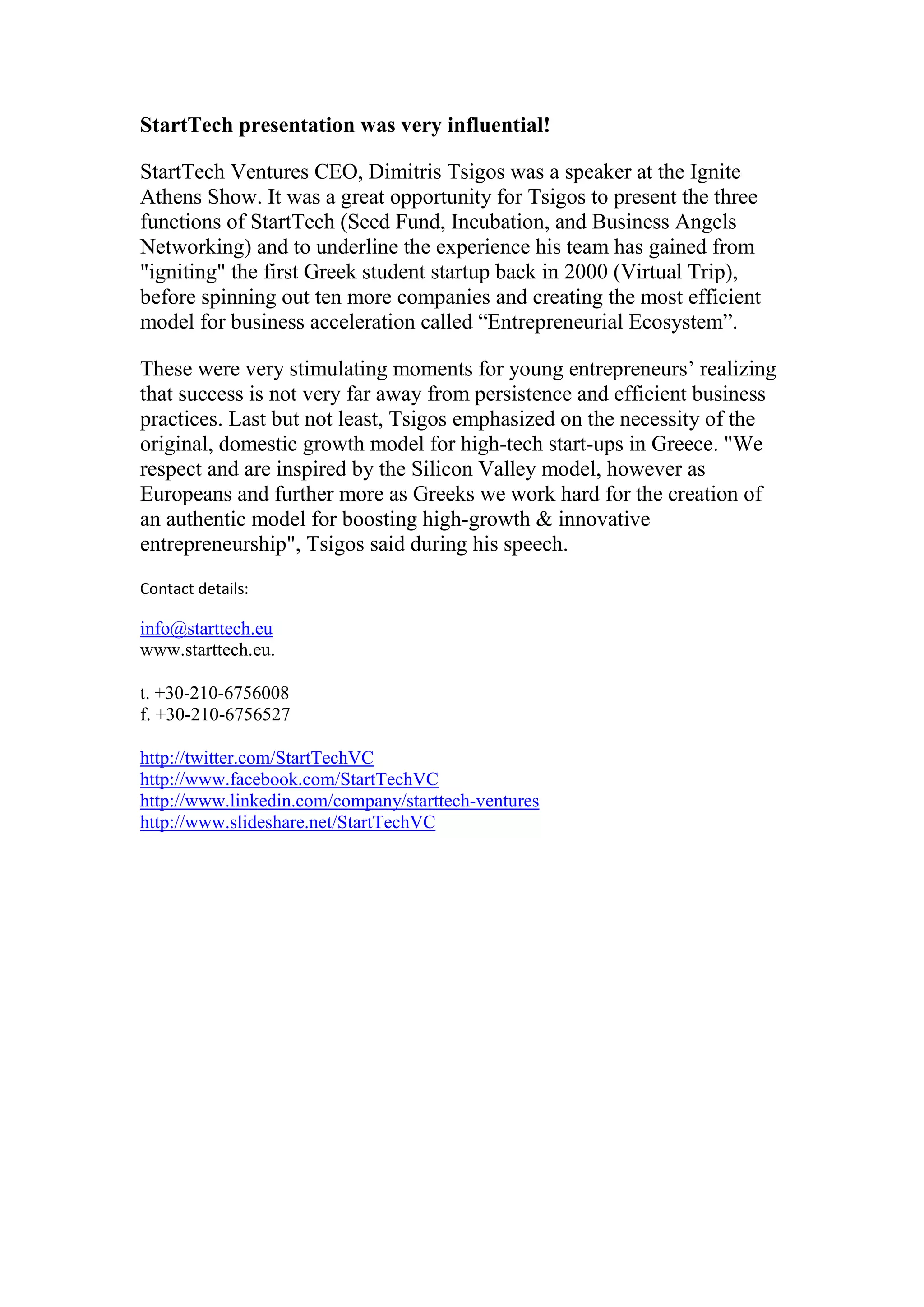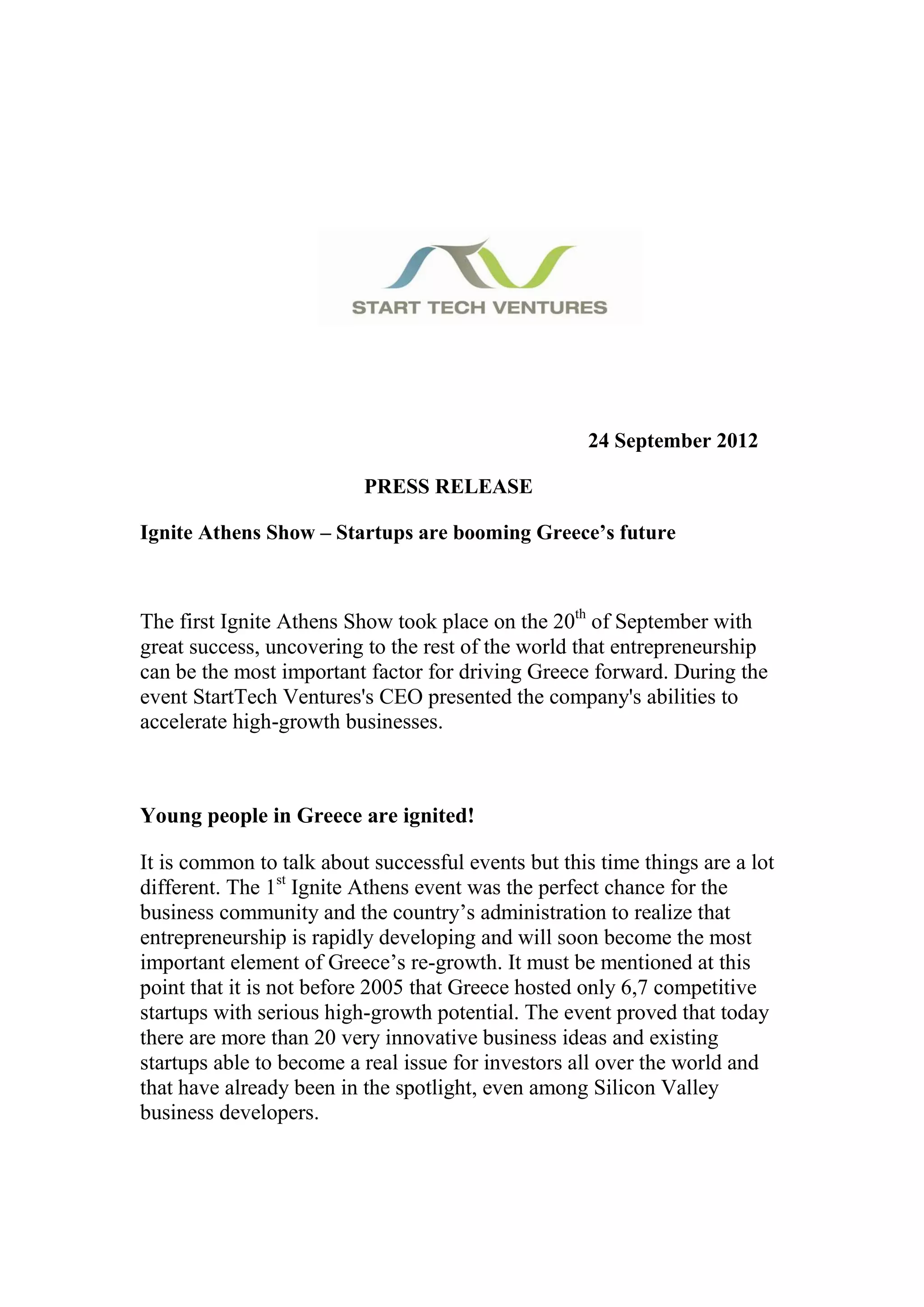 The first Ignite Athens Show took place on September 20th and was a great success, showing that entrepreneurship can drive Greece's future. Over 20 innovative Greek startups presented with potential to attract global investors. StartTech Ventures' CEO Dimitris Tsigos spoke about StartTech's abilities to accelerate high-growth businesses through seed funding, incubation, and networking. Tsigos emphasized the need for Greece to develop its own authentic model for boosting innovative entrepreneurship, inspired but distinct from Silicon Valley. The event ignited young entrepreneurs and the business community showed entrepreneurship will be key to Greece's growth.