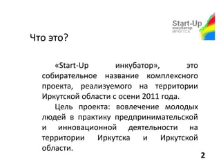 Проект 'start-up инкубатор' в Иркутске, запущенный в 2011 году, направлен на вовлечение молодёжи в предпринимательскую и инновационную деятельность. Он предлагает поддержку начинающим предпринимателям через образовательные мероприятия, инвестирование идей и создание сообществ. В рамках проекта действуют молодёжная организация, управляющая компания и офис коллективного пользования.