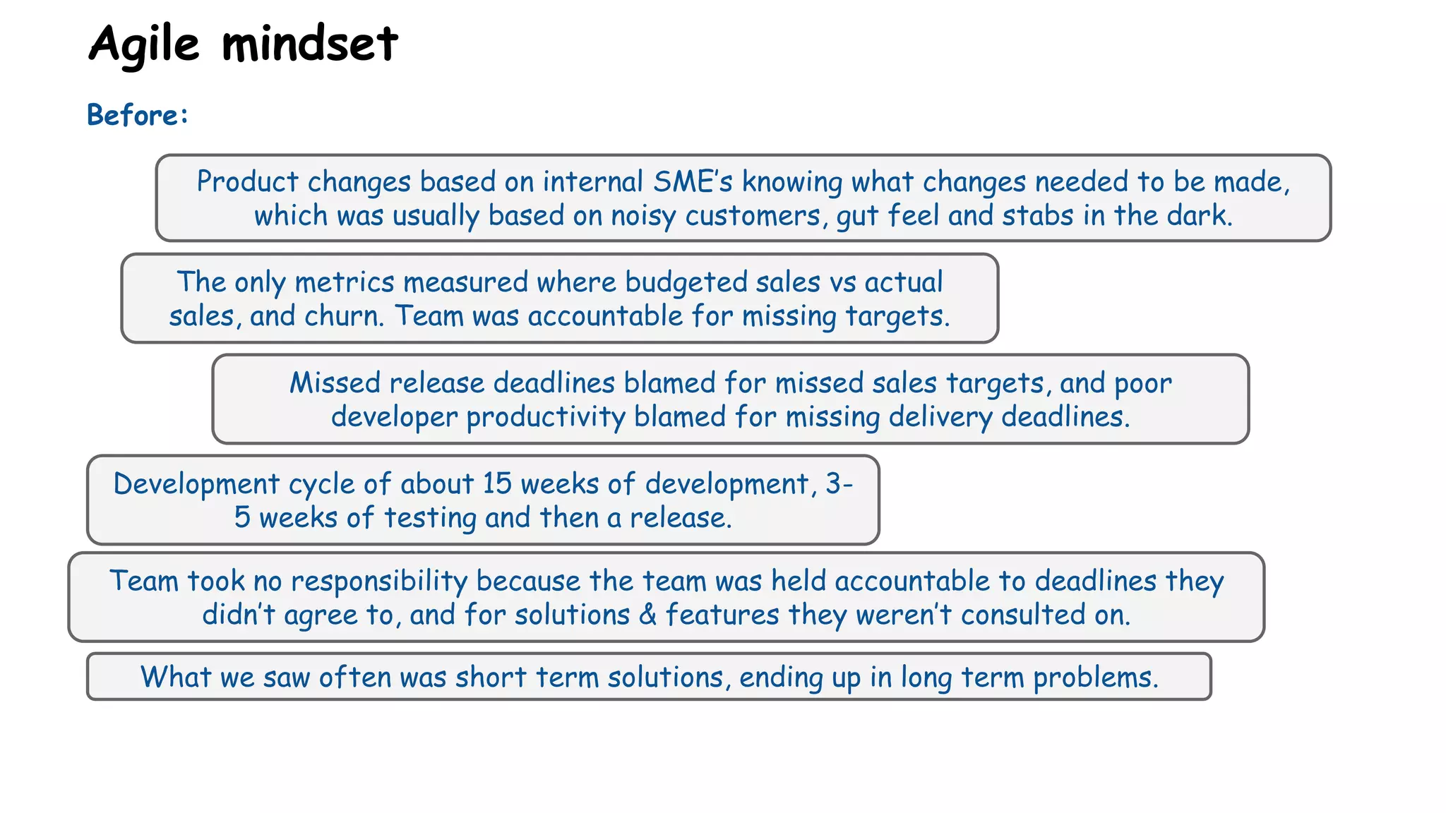 The document outlines a transition in an agile testing environment, shifting from a blame-focused culture to one emphasizing autonomy and accountability among team members. It highlights the importance of continuous testing, measuring business health, and maintaining a streamlined feature pipeline to improve product development outcomes. Key strategies include using value proposition canvases, iterating for problem-solving, and fostering a collaborative team environment to enhance efficiency and product quality.