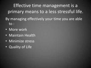 The document outlines strategies for effective time management to reduce stress, including planning each day, prioritizing tasks, saying no to nonessential tasks, delegating work, taking breaks, getting sufficient sleep and exercise, and asking for help in managing time if needed. Effective time management allows people to get more work done, maintain their health, minimize stress, and improve their quality of life.