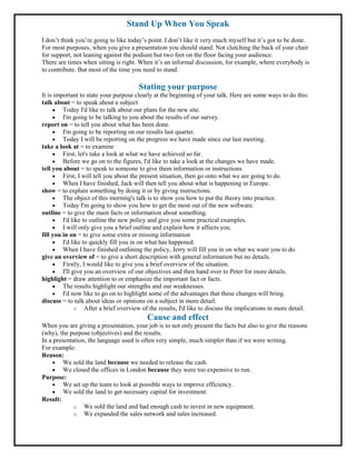 The document provides tips for presenting yourself in a seminar or short presentation. It discusses establishing eye contact with friendly faces in the audience to help with nerves. It recommends standing up when speaking and stating the purpose clearly such as talking about, reporting on, or outlining a topic. The document also discusses dealing with questions by thanking people and addressing both relevant and irrelevant questions.