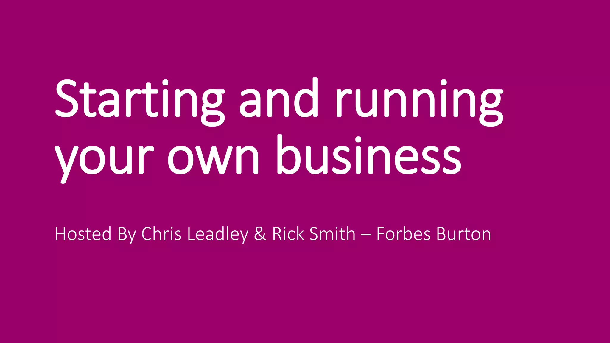 The document outlines essential steps for starting and running a business, presented by Chris Leadley and Rick Smith. It emphasizes the importance of having strong products and services, solid foundations and branding, and a customer base, along with actionable marketing strategies. The authors also encourage participants to brainstorm business ideas in a workshop-style discussion.