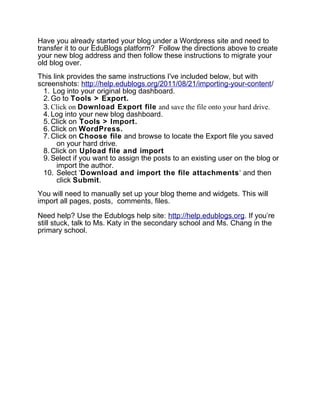 The document outlines the steps for teachers and students at LIS to start blogging on a new school platform supported by Edublogs. It includes instructions for creating a blog, setting privacy settings, and migrating content from existing WordPress blogs. Additionally, resources for assistance and challenges to enhance blogging skills are provided.