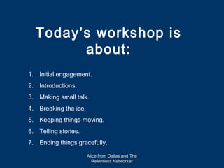 The NDCC networking skills workshop covers strategies for initiating conversations, introductions, making small talk, and storytelling. Key techniques include maintaining eye contact, listening actively, and gracefully ending discussions while fostering connections. Participants are encouraged to practice conversation starters and follow-up strategies to enhance their networking effectiveness.