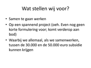 Wat stellen wijvoor?Samen te gaan werkenOp een spannend project (oeh. Even nog geen korte formulering voor; komt verderop aan bod)Waarbij we allemaal, als we samenwerken, tussen de 30.000 en de 50.000 euro subsidie kunnen krijgen