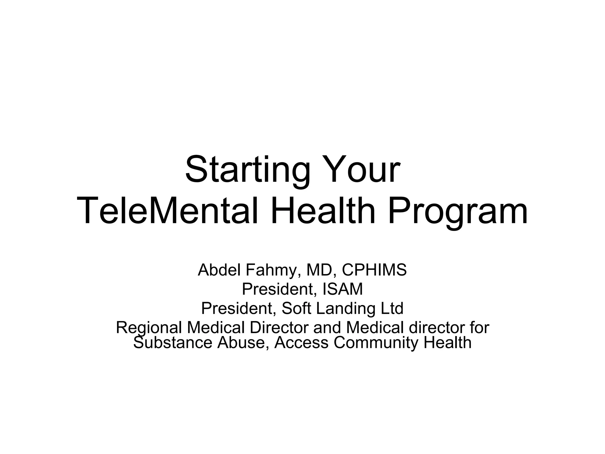 Starting Your TeleMental Health Program outlines key steps for developing a tele-mental health program, including conducting a needs assessment, establishing policies and procedures, ensuring HIPAA compliance, obtaining proper equipment, providing training to staff, and documenting medical records. Tele-mental health programs allow for the delivery of mental healthcare through videoconferencing technology regardless of patient location. Reimbursement for tele-mental health services varies by state and insurance provider.