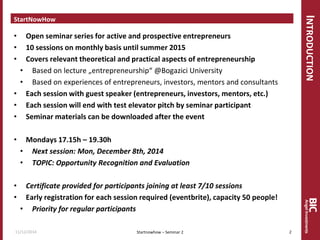 The document describes an entrepreneurship seminar series that covers relevant theoretical and practical aspects of entrepreneurship. It discusses 10 planned seminar topics, including opportunity recognition, business models, marketing, and financing. Descriptions of past seminar topics are also provided, such as definitions of entrepreneurship, myths about entrepreneurship, and the characteristics and stressors commonly experienced by entrepreneurs. The seminar series aims to provide participants with a certificate upon completing at least 7 of the 10 sessions.