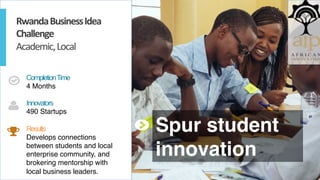 The document outlines an online competition management platform designed to connect innovators with local enterprises and investors, promoting student innovation and entrepreneurial networking. It details various challenges and competitions tailored for startups, emphasizing the importance of mentoring and community engagement. Additionally, it highlights the platform's customizable features for managing competitions efficiently while simplifying the involvement of judges and participants.