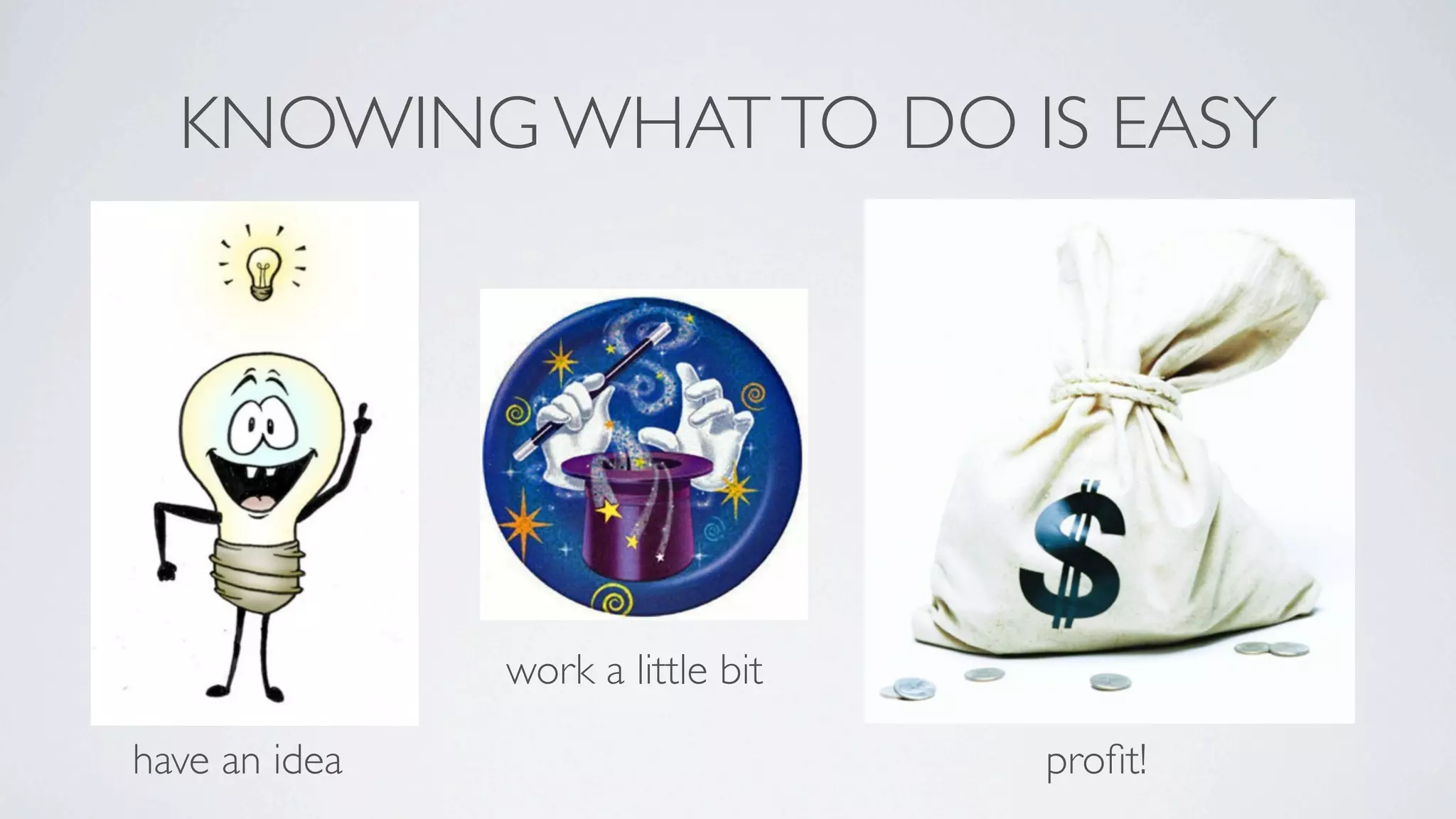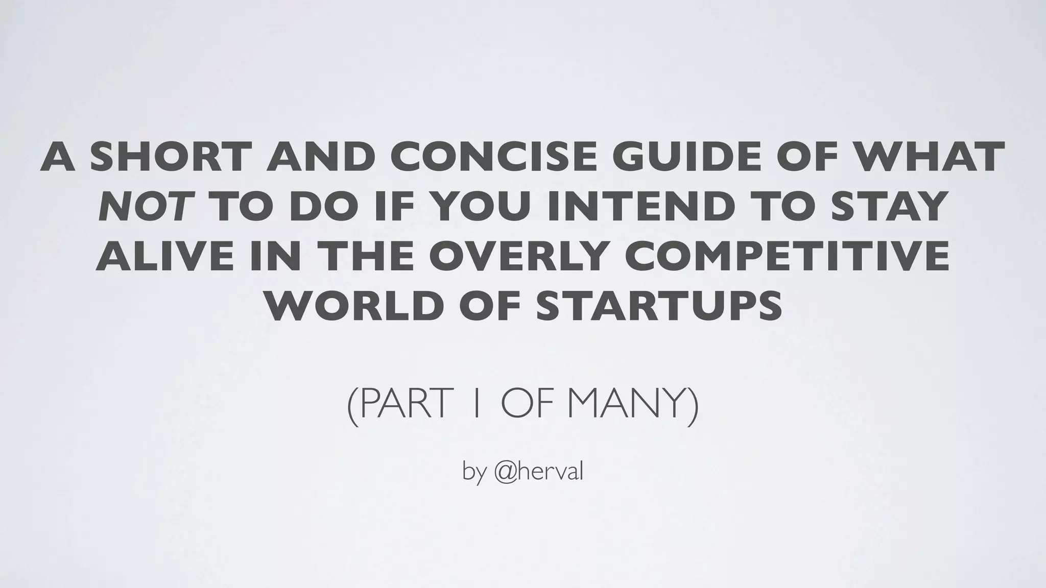 This document provides a concise guide of what not to do when starting a startup. It lists common mistakes that can slow progress, such as overengineering solutions, underestimating costs, and being too stubborn to pivot ideas that are not working. The author emphasizes the importance of building the minimum viable product quickly, having funding to cover costs, ignoring naysayers, and learning from both successes and failures. The overall message is that perseverance is key to eventual success in the competitive world of startups.