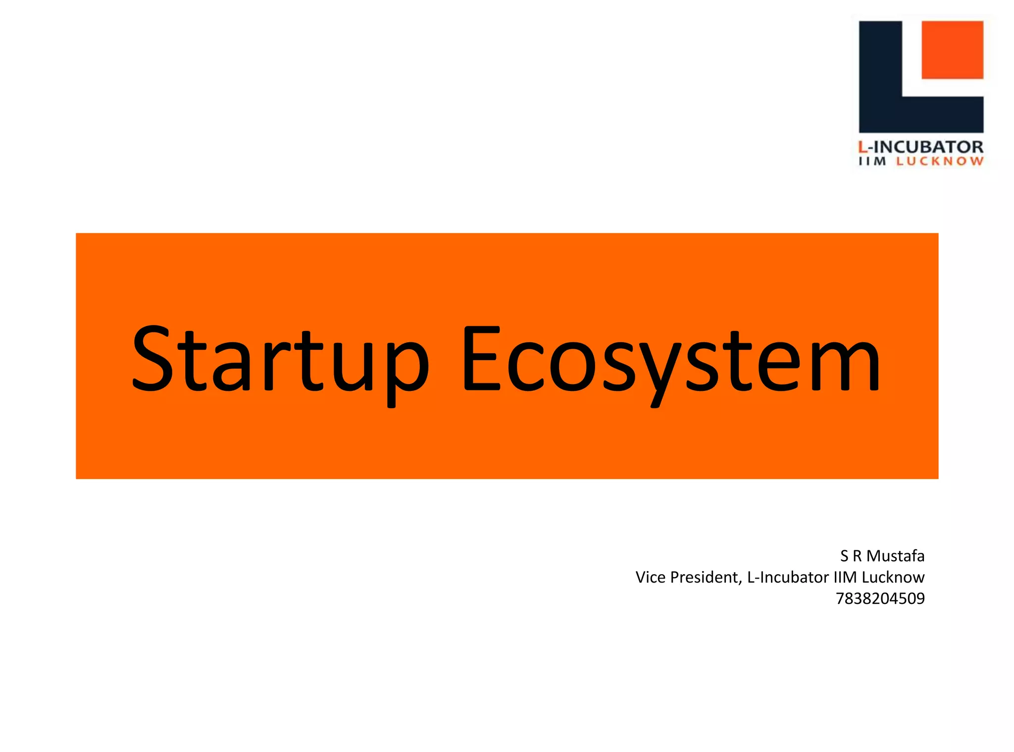 The document discusses the Indian startup ecosystem. It provides an overview of key trends in the Indian startup landscape and funding environment in 2016. Some highlights include an estimated 4,750+ tech startups in India, with around 1,400 new startups incorporated in 2016. Total funding amounted to $3.8-4 billion, down from 2015 but with around 8% more startups receiving funding. Bengaluru, Delhi-NCR and Mumbai accounted for about 70% of Indian startups. Emerging areas drawing investor interest included financial technology, education technology, healthcare technology, and cloud/analytics solutions.