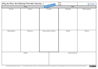 This document presents the Startup Founder Canvas, a tool for startup founders to define their values, vision, strategy, organization, motivations, missions, skills, means, needs, commitments, purpose, and key success criteria. The canvas includes sections for both an individual founder's perspective as well as a collective team perspective. It is meant to complement the Business Model Canvas and help founders develop a holistic understanding of their motivations and goals beyond financial metrics.