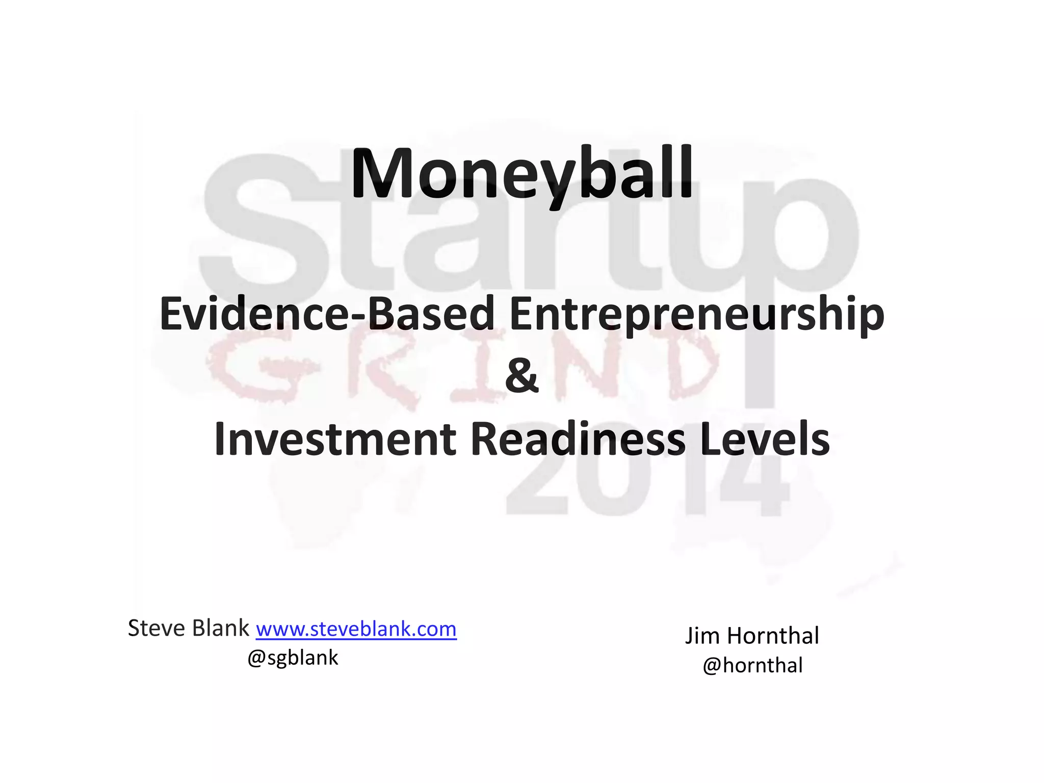 The document discusses evidence-based entrepreneurship and investment readiness levels (IRL). It presents the Lean Startup methodology, customer development, business model canvas, agile engineering and hypotheses testing as part of the evidence-based methodology. It discusses how IRL can assess project maturity similar to NASA's technology readiness levels (TRL) by focusing on data from experiments and customer interviews. Several examples are presented of teams applying this methodology in NSF programs to validate hypotheses, the business model and determine IRL.