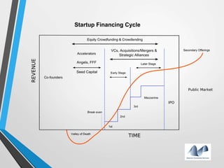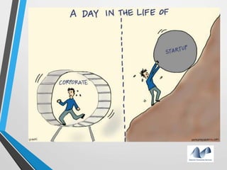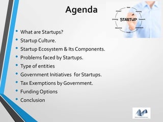 The document provides an overview of startups in India, including what defines a startup, the startup culture and ecosystem. It discusses the types of problems faced by startups as well as common entity types. The document also outlines several government initiatives to support startups, such as the Startup India program, tax exemptions, and sources of funding. It notes that the biggest question facing startups is fundraising and provides tips on valuation, dilution, finding investors, and structuring the fundraising process.