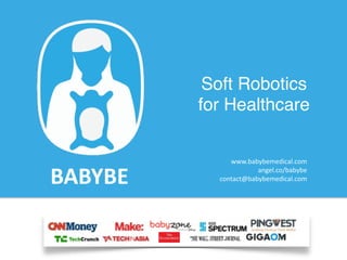 BABYBE is developing a soft robotic solution called Babybe that aims to provide premature babies the feeling of their mother's touch inside an incubator. Babybe collects a mother's biosignals like heartbeat and breathing and uses pneumatic actuation to replicate these signals through a bionic mattress inside the incubator. This allows the mother to feel like she is caring for her baby from the first minute. Babybe seeks to reduce hospital stays for premature babies and improve their development by providing this maternal connection, at a lower cost than existing NICU camera solutions. Initial medical trials have been conducted in China and Chile with further plans to expand to markets in Europe, Latin America, and Asia.