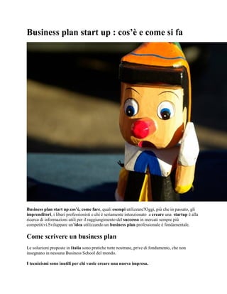 Il documento discute l'importanza di un business plan professionale per le startup e critica le pratiche insegnate in Italia, sostenendo che sono inefficaci e prive di basi solide. Mette in evidenza come molti imprenditori falliscano perché trascurano il marketing e si concentrano troppo su aspetti tecnici, suggerendo che le aziende di successo si basano su strategie di marketing adeguate piuttosto che su interviste al mercato. Infine, propone che i corsi di formazione dovrebbero focalizzarsi sulla risoluzione dei problemi e sulla creazione di un business plan personalizzato, piuttosto che su tecniche di marketing obsolete.