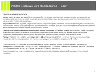 Проект «Стрибойл Плюс» направлен на разработку нанодисперсных противоизносных составов, способных значительно снизить трение и износ механизмов, используя новые технологии на основе природных минералов и синтетических веществ. Повышение устойчивости конструкции и снижение энергопотребления, а также улучшение характеристик по сравнению с аналогами делают данный проект актуальным для различных отраслей. Ожидаемая коммерциализация продукта подразумевает выход на рынок с множеством партнеров и инвестиций для дальнейшего развития.