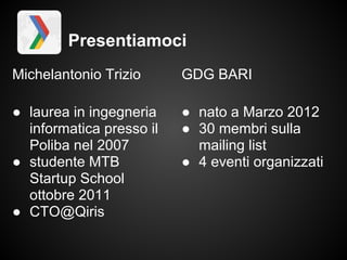 Il documento presenta un bootcamp per la creazione di startup organizzato da Michelantonio Trizio, manager di GDG Bari. Viene discusso il supporto di risorse come Google e la Kauffman Foundation per gli startupper, insieme a strumenti pratici come Google Apps, Git e Github per sviluppare e gestire progetti imprenditoriali. Inoltre, sono forniti suggerimenti per la registrazione di domini, monitoraggio degli utenti e pubblicità.