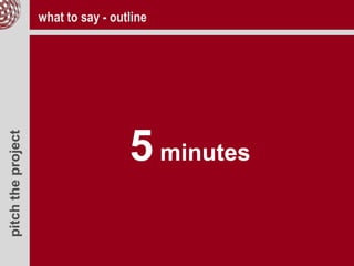 The document provides an outline for pitching a project, startup, or company. It includes sections to describe the problem and solution, product and market details, business model and sustainability, marketing and financial plans, validations and learning, past and future startup weekends, the founder's background and what is needed from the jury. Tips are given to use one's time wisely, keep it concise with images and video, have the best speaker, and to have fun and be ready to believe in oneself.