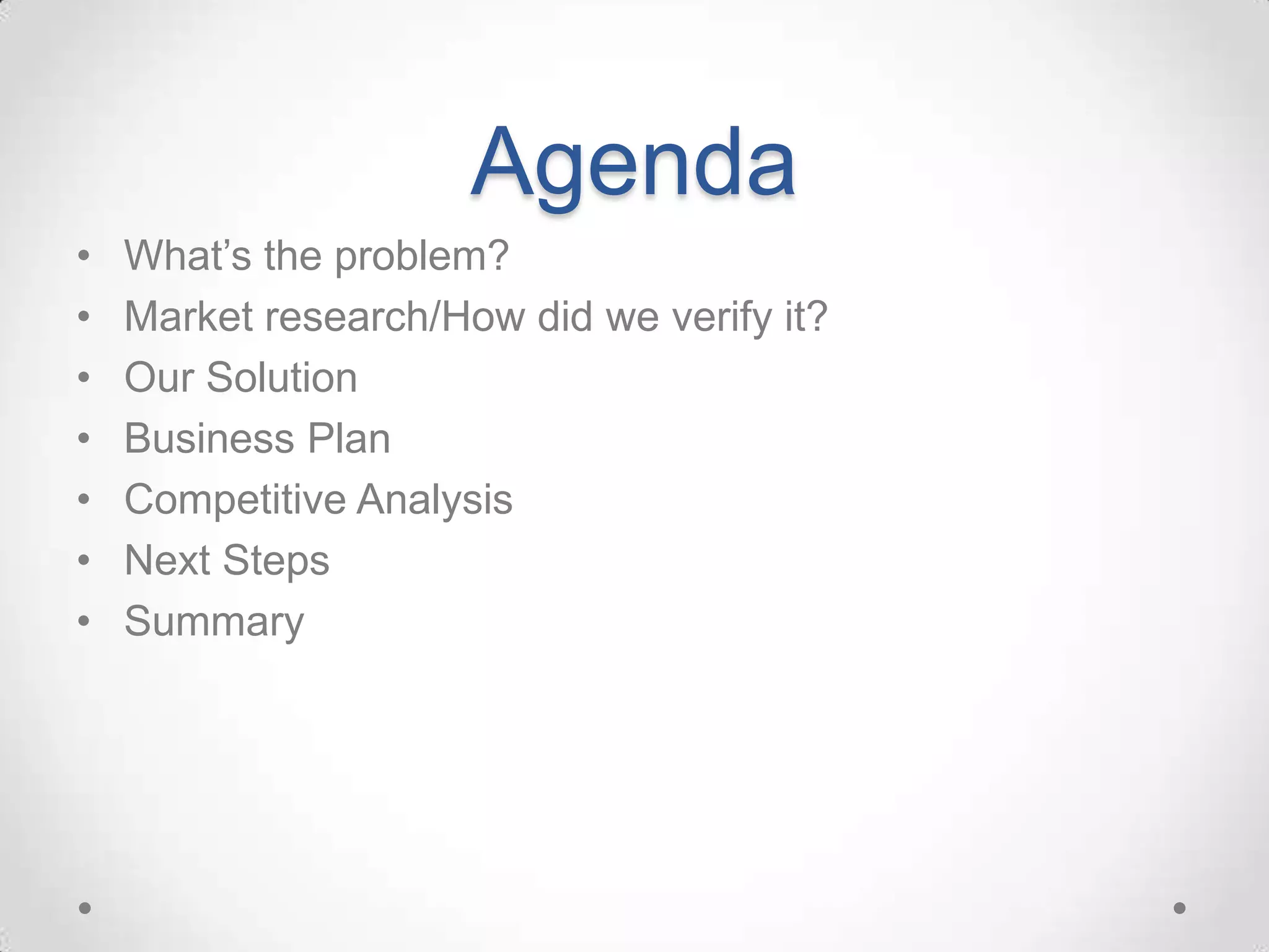 This document contains an outline for a startup weekend presentation template. It includes sections to address the problem being solved, market research validating the problem and solution, a description of the proposed solution, business plan, market opportunity and competitive analysis, next steps, and time for questions. The goal of the presentation is to clearly explain the problem being solved, how the solution was developed and validated, the business model and market opportunity, and next steps to seek funding or other support.