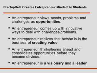 StartupCell promotes project-based learning in entrepreneurship to equip engineering graduates in India with essential skills and reduce unemployment rates. The program emphasizes the importance of entrepreneurial education, which fosters critical thinking, innovation, and prepares students for the global market. By providing support at each stage of the entrepreneurial journey, StartupCell aims to nurture young creators and innovators in an uncertain future.