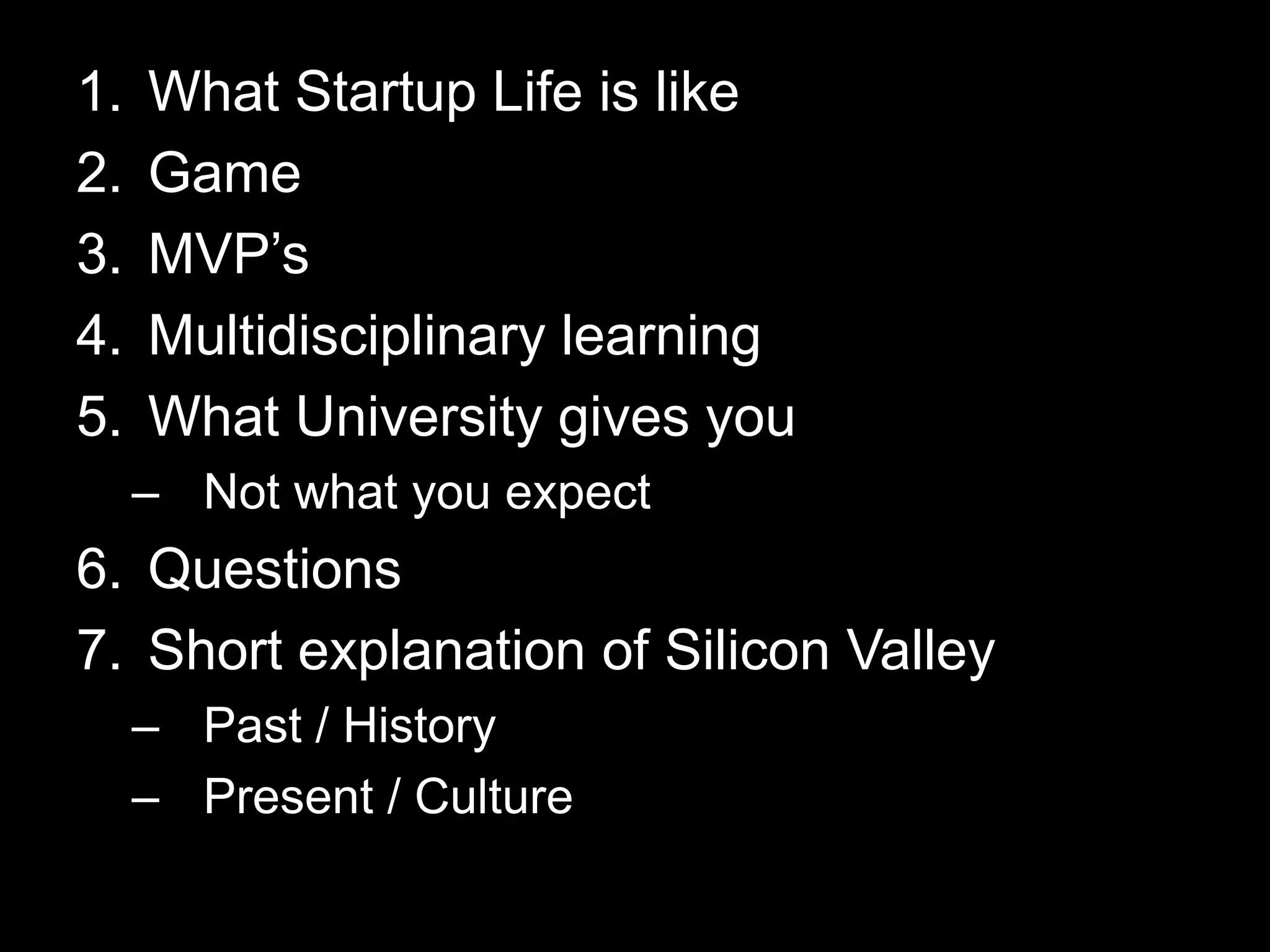 This document discusses life at startup companies and entrepreneurship. It begins by stating that "life is too short to work at a boring company". It then discusses what startup life involves, including minimal viable products (MVPs), multidisciplinary learning, and how university differs. It provides a short explanation of Silicon Valley's past and present culture. The document cautions that the author is not trained in all topics discussed and some content may challenge education models. It introduces the StartupDigest website and its curators. It then discusses concepts like MVPs, entrepreneurship as a game of learning, and the benefits of a multidisciplinary approach. It provides action items and concludes by addressing common questions about startups.