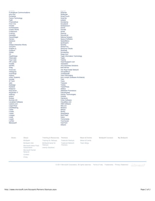 The document highlights various startups that are part of Microsoft's BizSpark program. It lists over 100 startups from around the world that are innovating in areas like online content/services, mobile solutions, collaboration software, business applications, and more. These startups benefit from access to Microsoft software through BizSpark, which allows them to experiment with solutions and validate business models at no cost while growing their businesses.